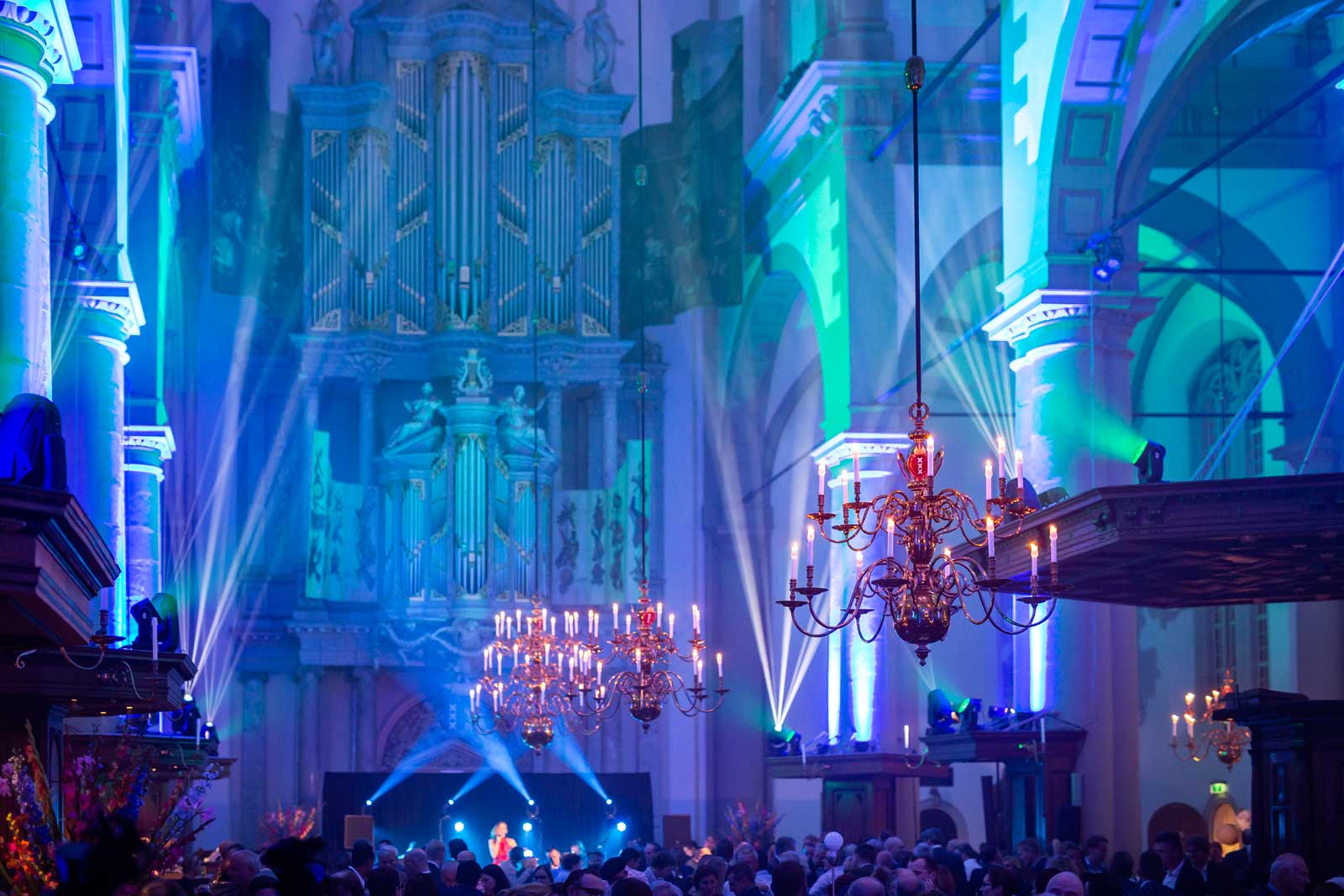 Het feest vond plaats In de Westerkerk te Amsterdam. Op deze locatie zijn wij al jaren vaste technisch leverancier zijn. Aan ons de opdracht om met een compleet audiovisueel plan te komen voor het uitlichten en versterken van een diner, optreden en feest voor ruim 400 personen.